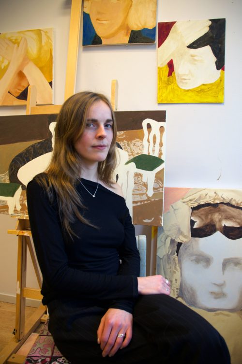 Klara Wikström – her process starts with scenes from a doll’s house, arranged from her memories and impressions. In the painting’s room, realism negotiates with the fictional. The fictional takes place in the space between human imitations and depictions. By using real but inaccessible, diminished, plastic elements, such as dolls and miniature houses, she tries to immerse herself in the moods that arise in the revelation, the dizziness, the departed, the love, and death. She tries to paint as if she were in a state of dizziness, she sees it as a state between wakefulness and sleep. The puppets function as actors, in an environment that mimics that of humans. The doll is stiff and without feeling, created for man to be able to reflect himself in, fantasize about, and realize dreams with – in painting.